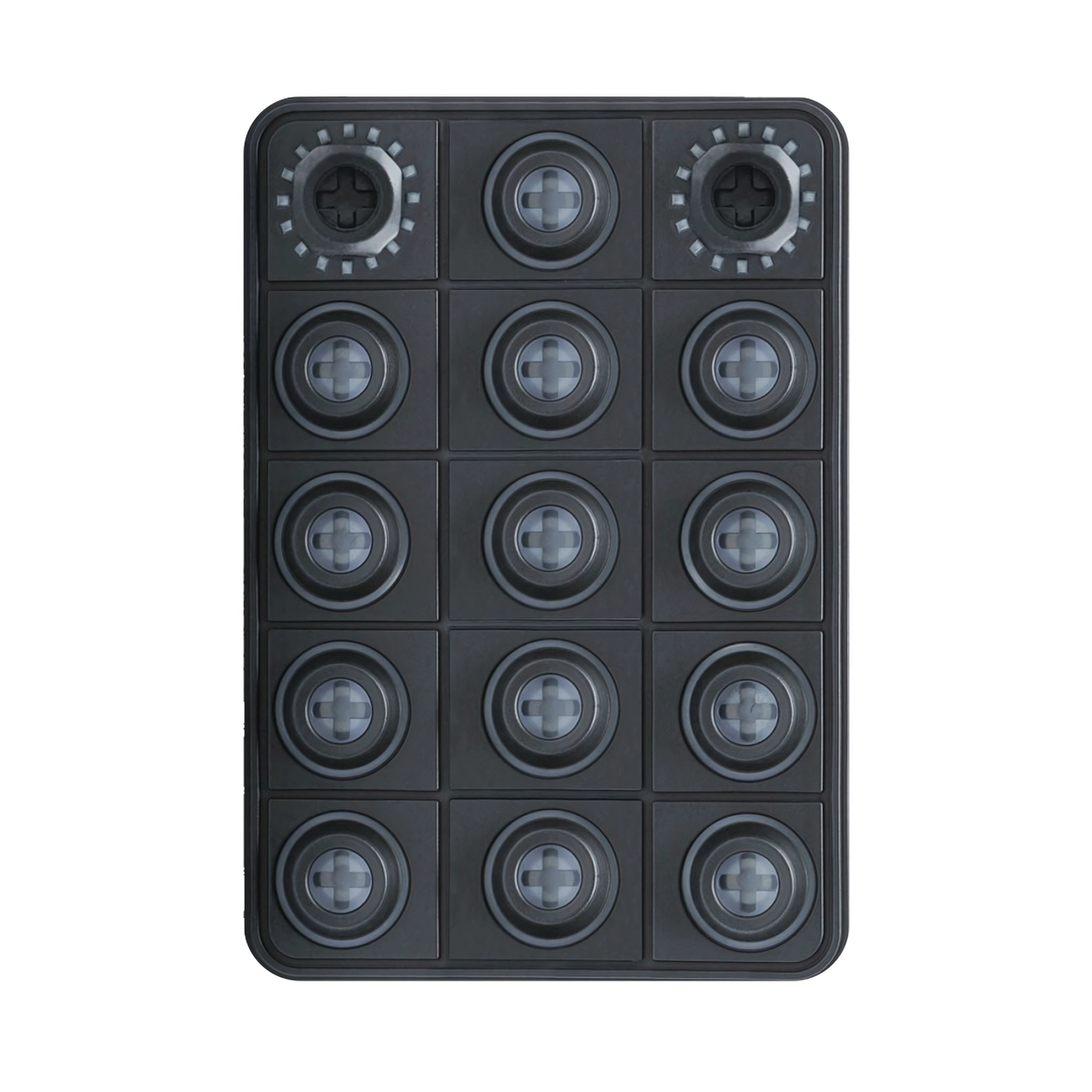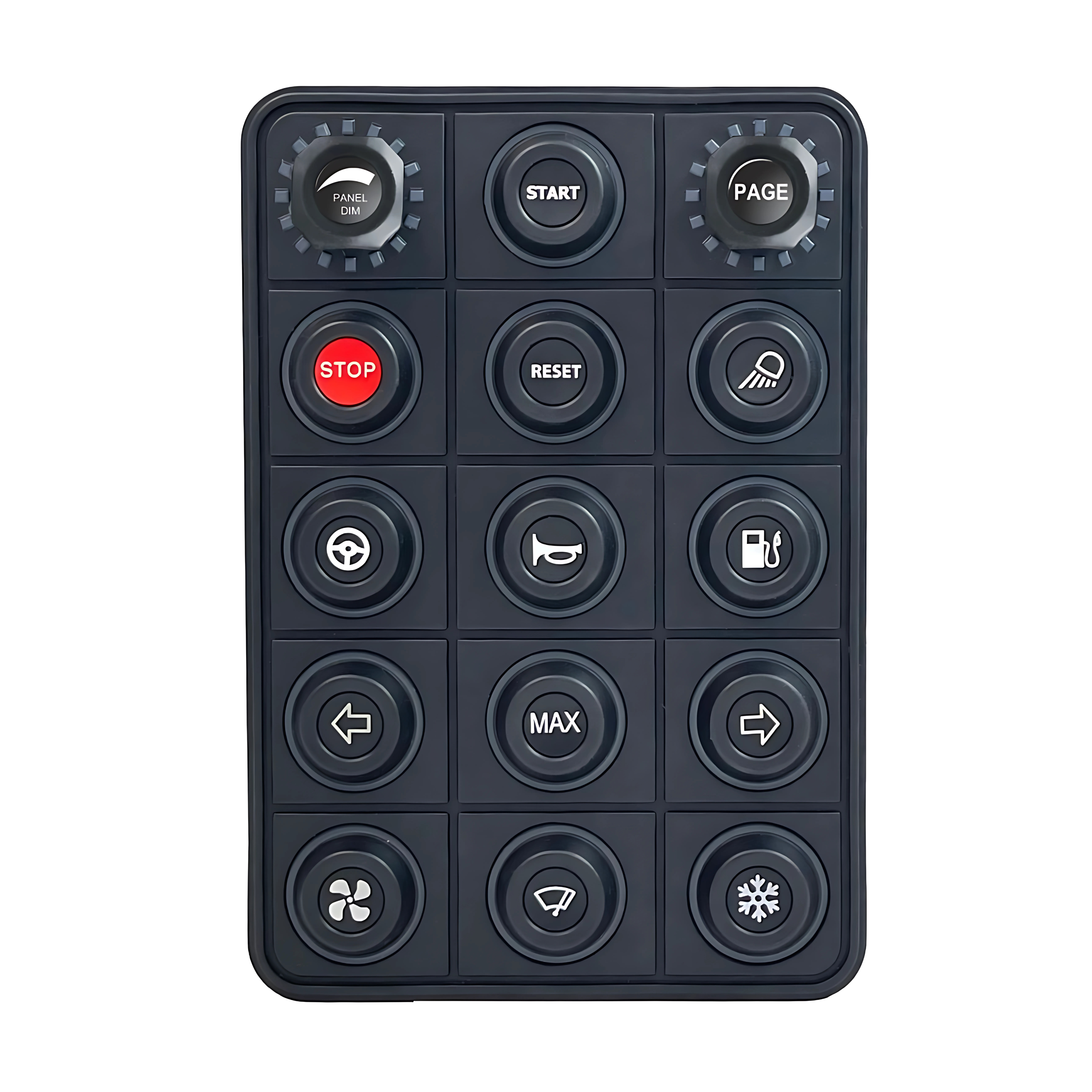 Rugged 15 button CAN Keypad with interchangeable 15mm inserts (sold separately). Two rotary encoders with 16 Blue indicator LEDs each. Four additional analog inputs allow additional sensors/switches to directly connect to the CAN Bus network through the keypad. The compact layout and inclusion of the rotary encoders and analog inputs allow for significant dash space saving while massively expanding functionality.