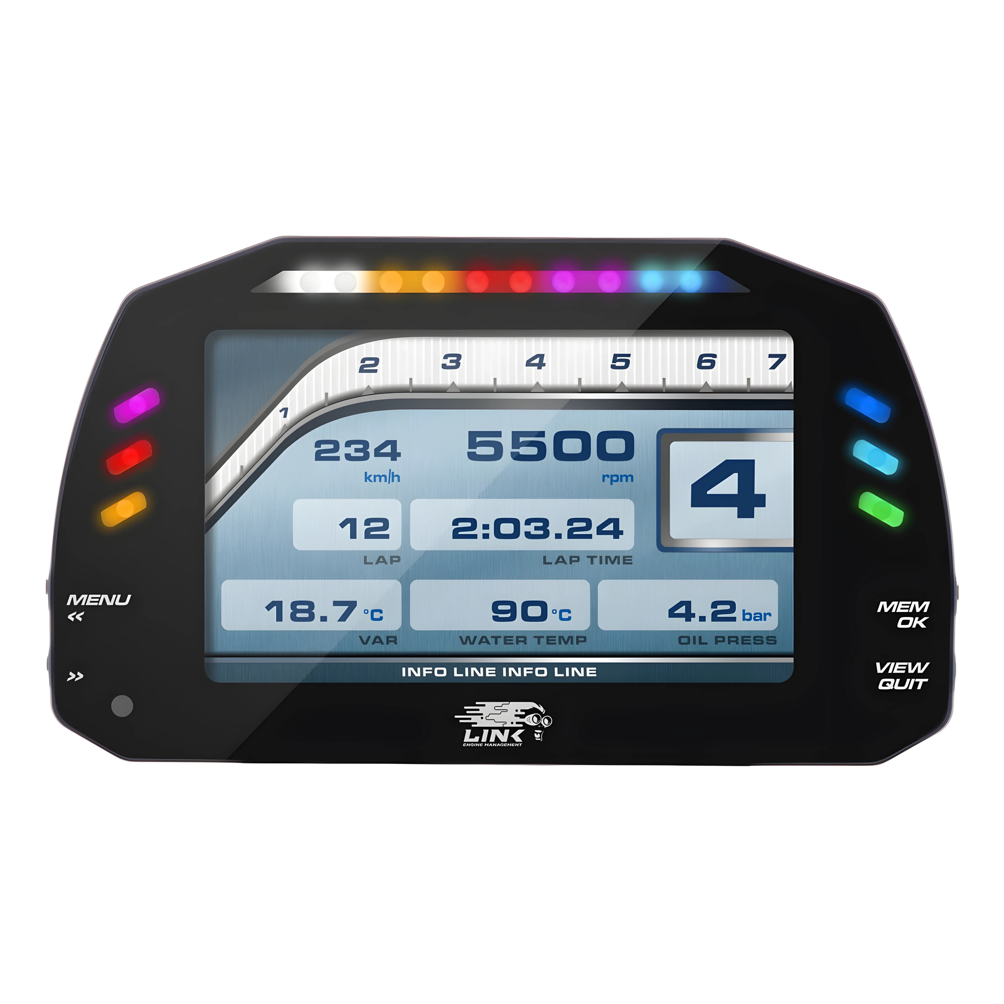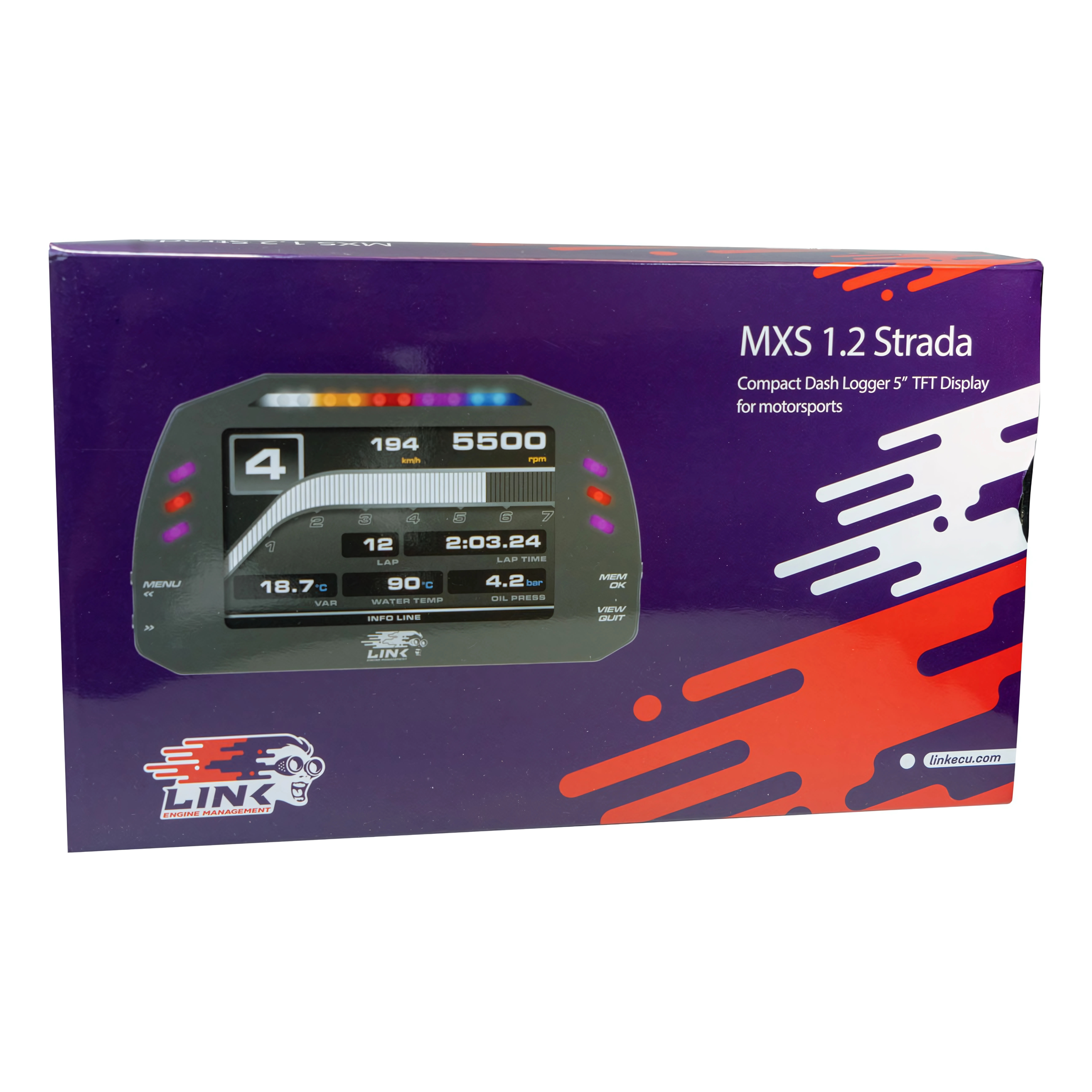 The Link MXS Strada Race Edition dash features customisable shift lights, flexible alarms and a high contrast 5-inch TFT screen display. Visual quality is always optimal as the ambient light sensor auto-adjusts the brightness of the display.