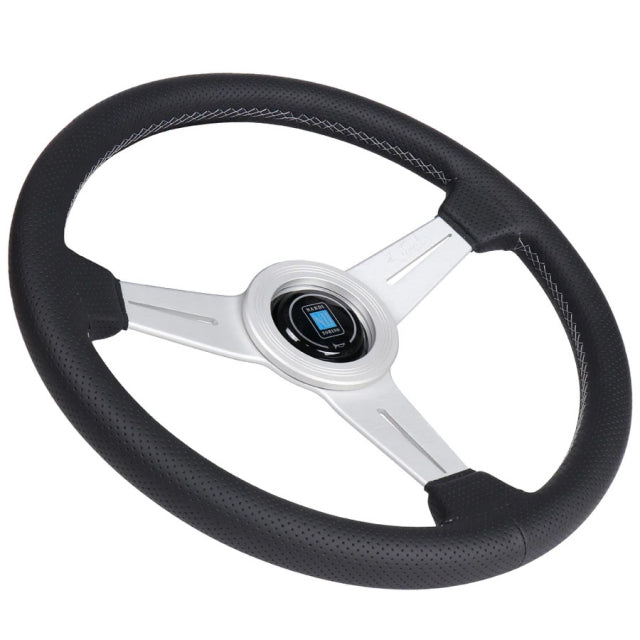 This Nardi Classic steering wheel has a black perforated leather hand grip, grey stitching, matte silver anodized spokes, matching silver center ring, hardware, and classic Nardi horn button.