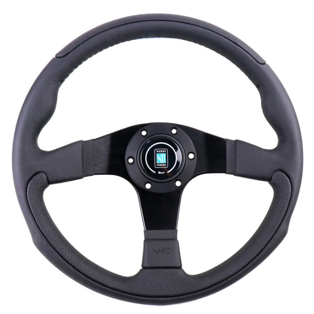 This Nardi Leader steering wheel has a black smooth leather hand grip, anodized black spokes, black dual stitching, matching black center ring, and Nardi horn button with hardware.